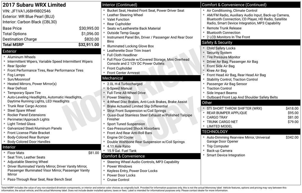 - Vehicle Name: Subaru WRX