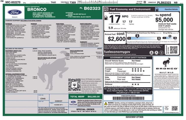 Powered by a 2.7L EcoBoost V6 engine and equipped with a 10-speed automatic transmission, the Bronco Badlands delivers exceptional performance and efficiency, with an impressive 17 mpg in the city and on the highway. Boasting a suite of advanced safety and technology features, this vehicle ensures a confident and connected driving experience.